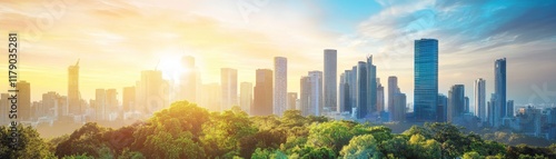 Magnificent cityscape, towering skyscrapers and lush green trees in harmony urban