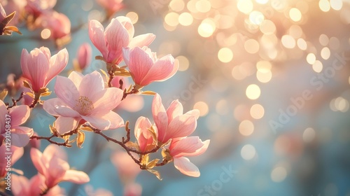 Magnolia flowers blooming in spring season with beautiful bokeh background at sunset
