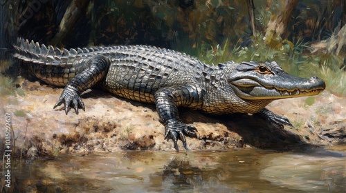 Majestic Alligator Basking in Sunlight by a Tranquil Riverbank in Natural Habitat