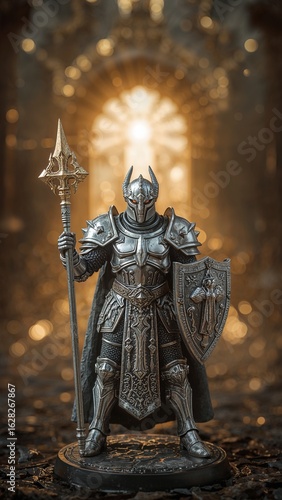 Majestic Armored Fantasy Knight Figure with Spear and Shield in a Glowing Golden Hall Intricate Details and Heroic Presence