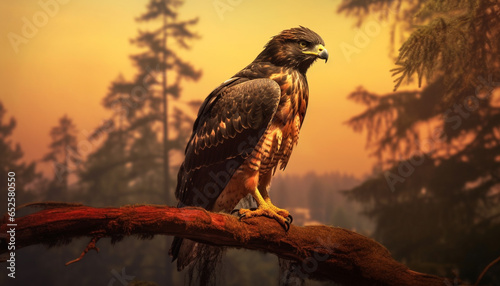 Majestic bird perching on branch, watching sunset in tranquil forest generated by AI