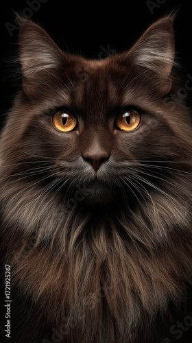Majestic black cat with striking golden eyes showcasing its thick fur against a dark backdrop during a quiet evening