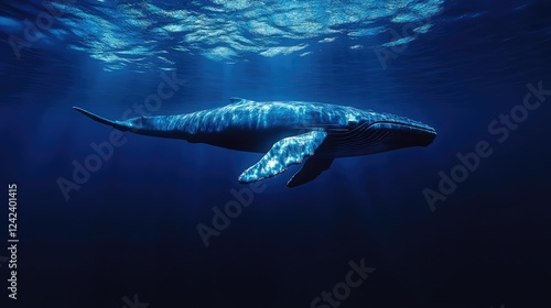 Majestic Blue Whale Gracefully Swimming Underwater in Deep Ocean, Showcasing Its Incredible Size and Beauty Amidst Stunning Blue Water Environment