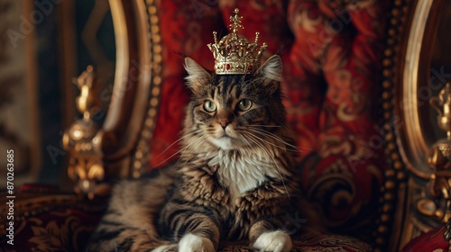 Majestic Cat Wearing Crown on Ornate Chair