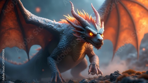 Majestic dragon soars through a fiery sky, showcasing power and grandeur in a fantastical landscape