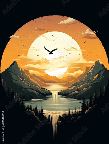 Majestic Eagle Soaring Over Sunset Mountainscape: A Serene Circular Artwork