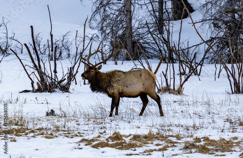 Majestic elk stands in the snowy meadow surrounded by leafless branches.