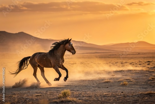 Majestic horse galloping across a dusty landscape at sunset, with mountains in the background
