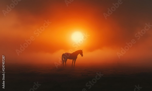 Majestic horse silhouetted against a fiery orange sunrise, standing on a foggy plain, with soft light casting a serene glow over the surrounding landscape