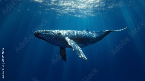 Majestic humpback whale gracefully swimming in deep blue ocean with sun rays illuminating water