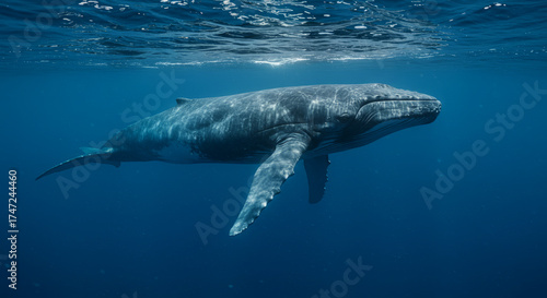 Majestic humpback whale gracefully swimming underwater in crystal clear blue ocean waters, a stunning marine creature