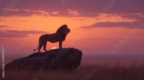Majestic lion silhouette standing proudly on a rock at sunset