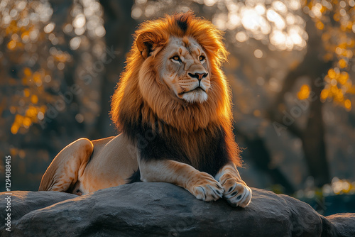 Majestic Lion with Golden Mane Resting on Rock in Warm Backlit Setting, Captured in a Close-up Portrait against Blurry Bokeh Background with hints of Gold Color