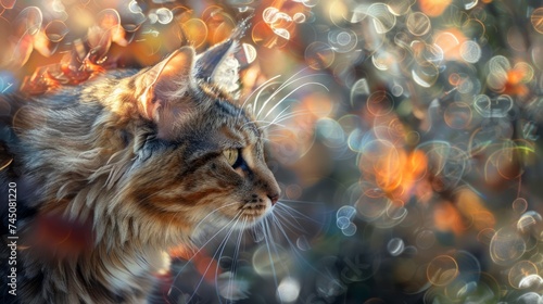 Majestic Maine Coon Cat in Sunlit Garden with Bokeh Background