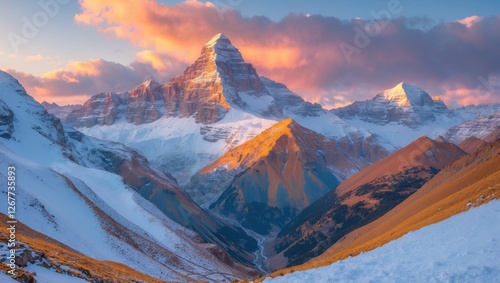 Majestic mountain landscape at sunset with snow-capped peaks and colorful clouds in the background showcasing natural beauty Copy Space