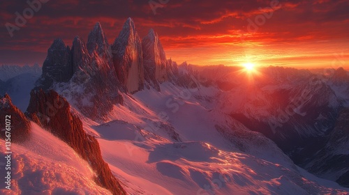 Majestic mountain peaks covered in snow illuminated by a vibrant sunset creating a dramatic and serene landscape with a warm glow