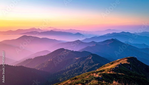Majestic Mountain Ridges at Dawn with Diffused Light Scenery Rocky Terrain Sparse Vegetation Golden Sky Blue Hue and Overlapping Peaks Serene Landscape