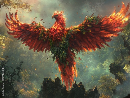 Majestic phoenix soars above the misty forest, wings ablaze with fiery hues.
