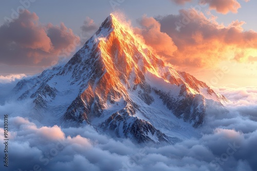 majestic snowcapped mountain peak piercing through billowing clouds ethereal sunlight creating heavenly glow around jagged silhouette