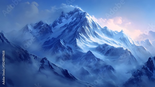 Majestic snow-capped mountain range bathed in soft morning light