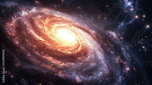 Majestic Spiral Galaxy with Bright Core and Colorful Gas Clouds in the Vast Cosmos, Showcasing the Beauty of Interstellar Space and Stellar Formation