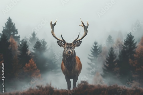 Majestic stag with antlers standing in a misty forest, surrounded by autumnal trees, creating a serene and mystical atmosphere.