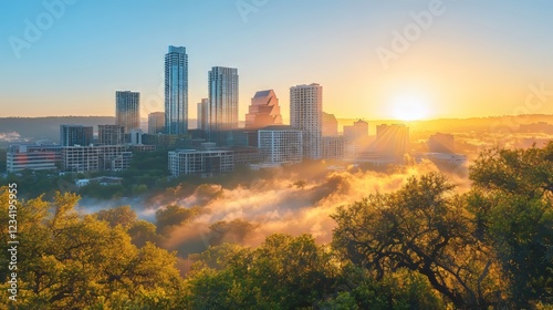 Majestic sunrise over Austin's skyline with misty trees in the foreground.