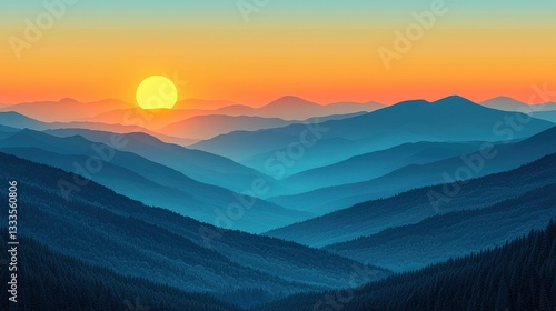 Majestic Sunset Over Mountain Range with Layers of Blue and Orange Hues in the Background