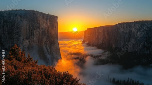 Majestic Sunset over Snowy Mountain Peaks with Fog
