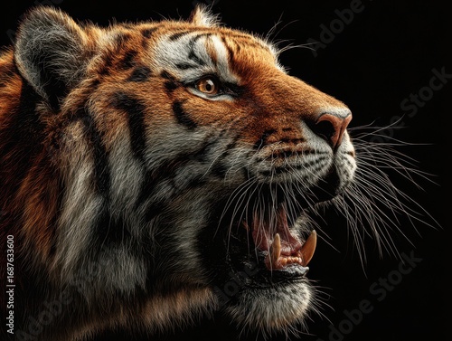 Majestic tiger roaring fiercely against a dark background in a close-up view