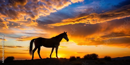 Majestic Western Horse Silhouette at Sunset - Dramatic Desert Landscape Stock Photo