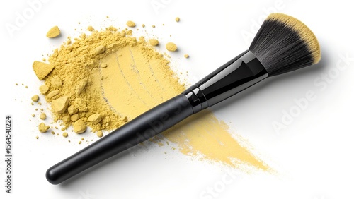 Makeup brush with crushed yellow powder on white background