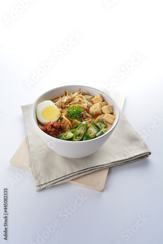 Malay mee rebus noodle with boiled egg, tofu, green chilli, sambal chilli sauce and hot thick curry gravy soup bowl in white background asian halal menu
