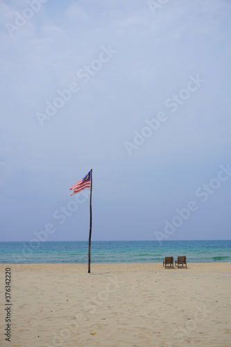 Malaysia flag waving at the Tioman island beach during hot afternoon day.