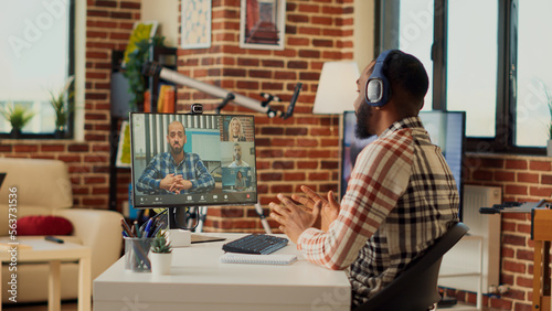 Male employee talking to people on online videocall conference, attending remote business meeting on webcam at home. Using internet teleconference call to chat remotely at desk.