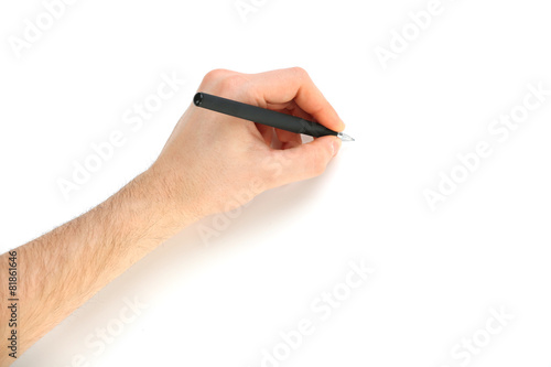 Male hand with pen isolated on white