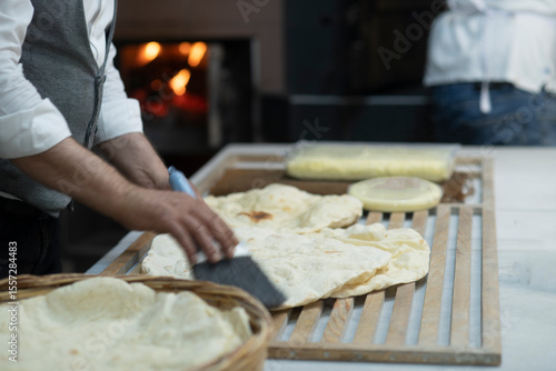 Male hands brushing freshly baked famous flat bread called lavaş in front of a wood burning fire in a traditional bakery in Turkey