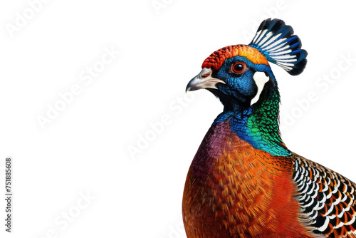 Male pheasant stands regal and fully detailed, isolation on white backdrop, contrasts highlighting iridescent plumage, sharp focus capturing texture, considering rule of thirds for visual interest