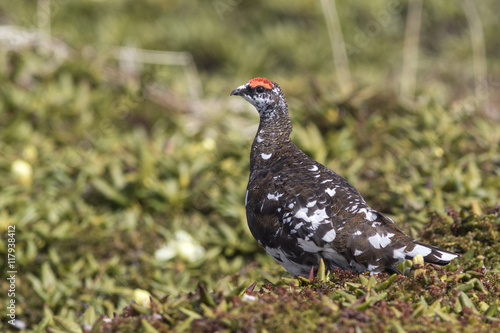 male Rock Ptarmigan in the summer tundra sunny morning