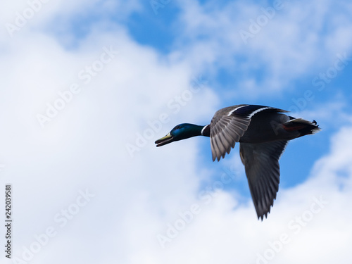 Mallard Duck Flying in a Blue Sky. Selective focus.