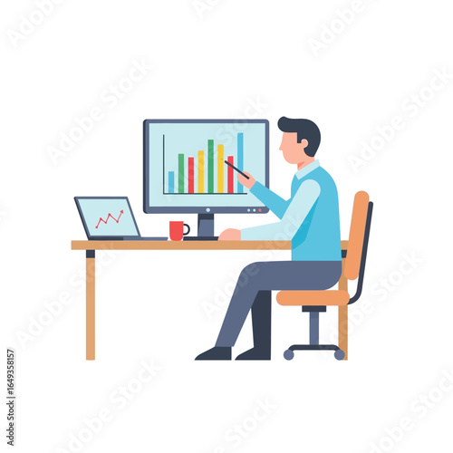 Man Analyzing Colorful Bar Graph on Computer Screen with Pointer.