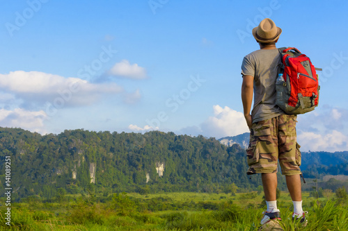 Man Asian backpack standing witon the rock and looking mountain background.Back of man