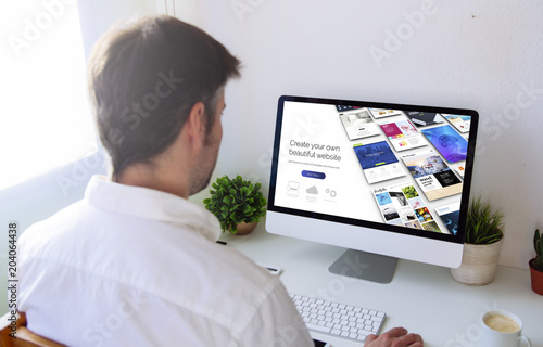 man browsing website builder on computer