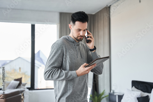 Man chatting via smartphone while looking at the tablet screen at home