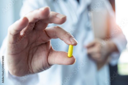 Man doctor showing to camera a yellow capsule while standing in the consultation.