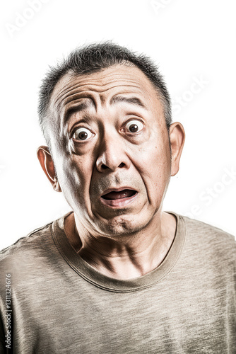 Man expressing shock and surprise with wide eyes and open mouth, isolated on white background, conveying strong emotions and reactions in everyday life.
