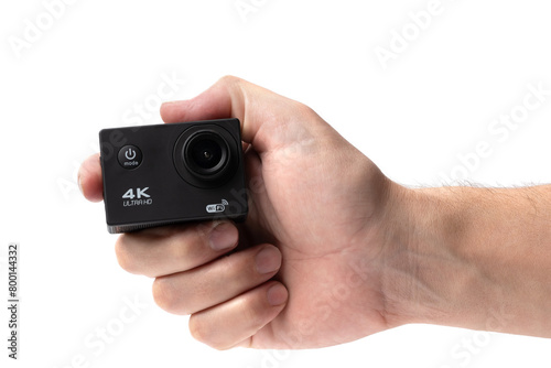 Man hand holding an action camera is highlighted on a white background.