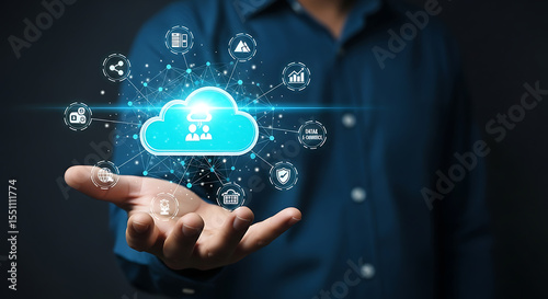 Man holding cloud computing illustration representing data storage and network connectivity
