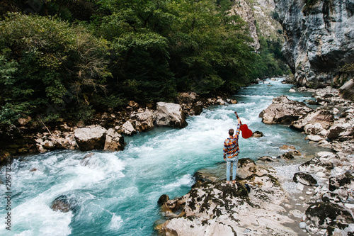Man holding guitar standing on the bank of a mountain river on a background of rocks and forest. Handsome hippie style guitarist engrossed on music outdoors. Shoot from the back. Concept of freedom