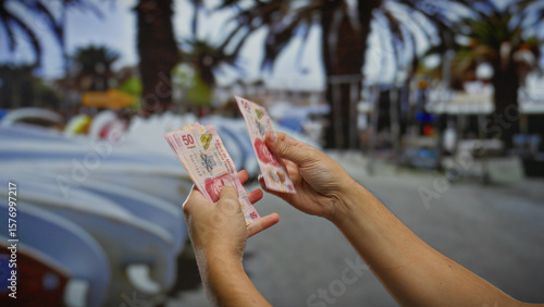 Man holding mexican pesos in an urban outdoor street setting with cars and palm trees, reflecting a business or investment theme in a city environment.